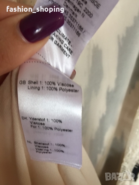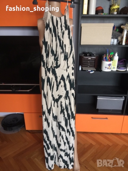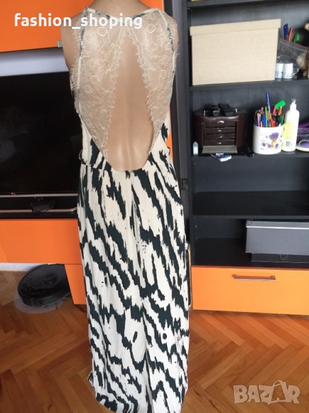 Разкошна дълга рокля на скъпия датски бранд Samsøe Samsøe. Най- силният й акцент е дълбоко изрязания гръб, Дантелата в областта на гърба придава романтика и кокетност. Голи рамене, дължина до глезена. С тази рокля ще се чувствате много удобно, прохладно и същевременно стилна. Основният тон е цвят пудра с черно и тъмносиви краски, които имат оттенък на тъмнозелено.