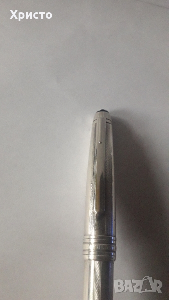 Montblanc Meisterstuck Solitaire 164S сребърна на ивици. Върху пръстена на клипа на химикалката е гравиран сериен номер EZ1001601, произведена в Германия през 90-те години на 20-ти век. Масивно сребро с проба Ag 925. Включва се със завъртане. Изключително рядък модел. В оригиналната си кутия, като липсва един от страничните капаци на картонената кутия, но вътрешната кутия е запазена. Страхотен инструмент за писане. От частна колекция.