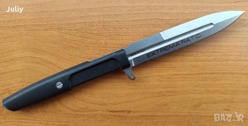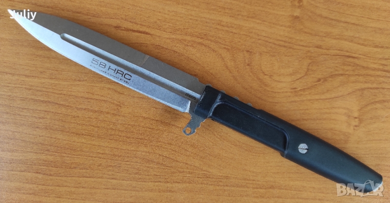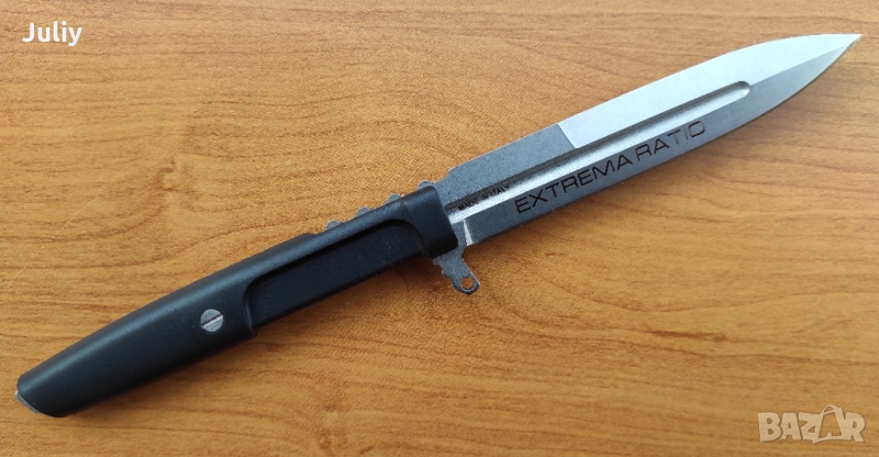 Отстрани на режещия ръб има тънък предпазител с отвор, който ви позволява да направите предпазна система с помощта на шнур. Върхът на върха не е с форма на лост, а по-скоро дебел, което прави възможно използването на върха на острието за тежка работа.