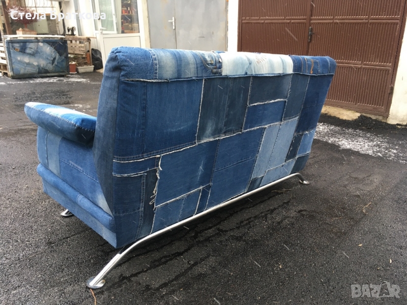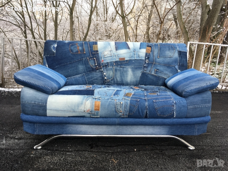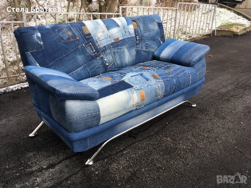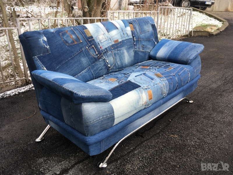 Претапициран двуместен диван в дънка . Рециклиране и изработване на дамаски от стари дънки . Интериорни решения подходящи за дом, градина и заведения . Алтернативни решения и идеи .