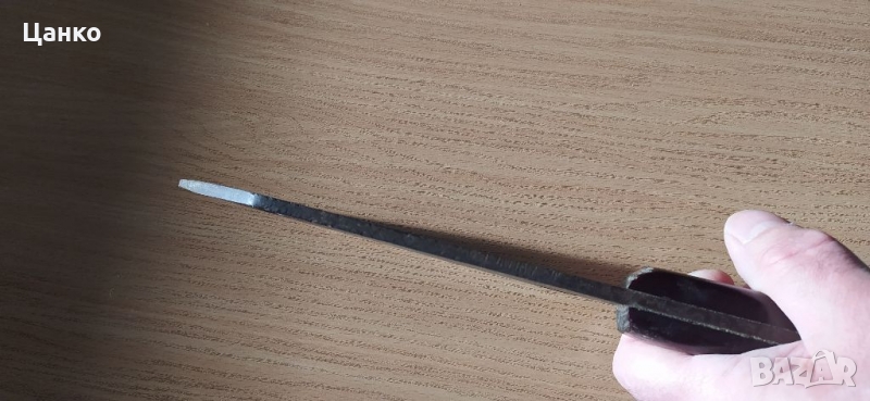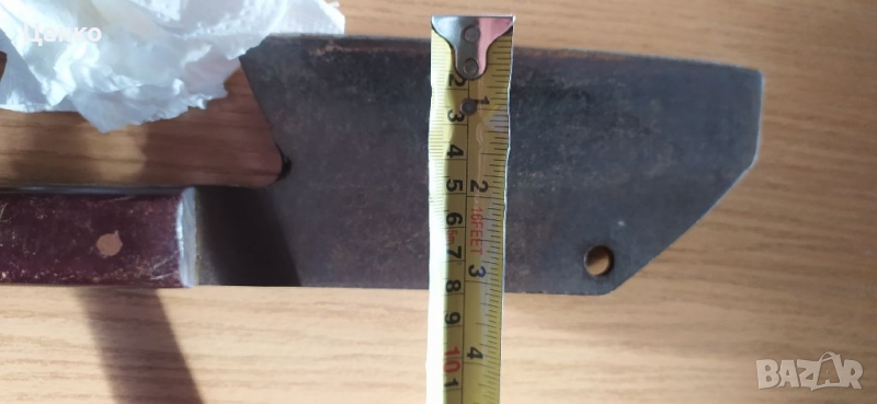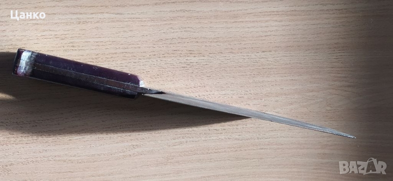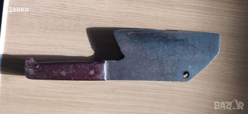 Стар домашен сатър. Не е като повечето сатъри, заточен на края на острието. А е плавно кован от 5мм. в дебелата част до 0мм. в острието. Размерите са на снимките.