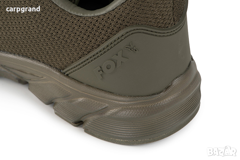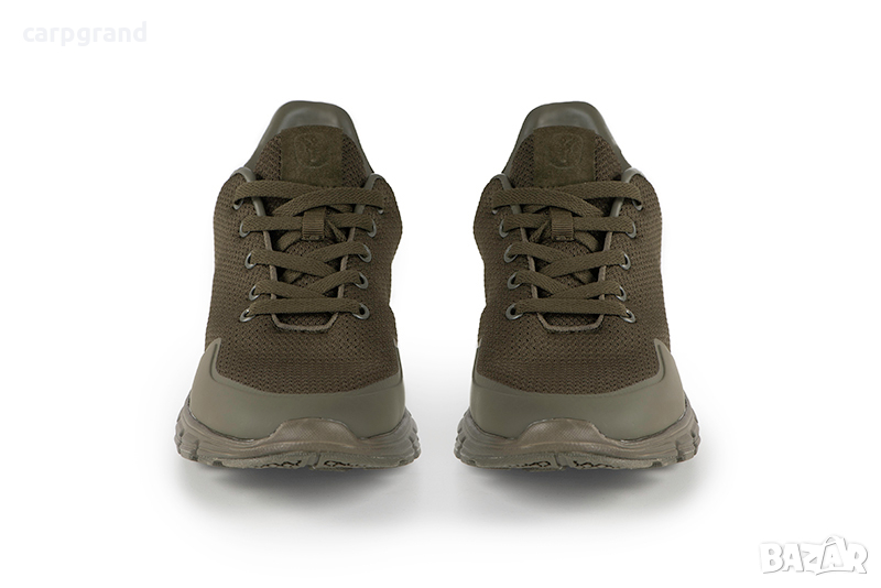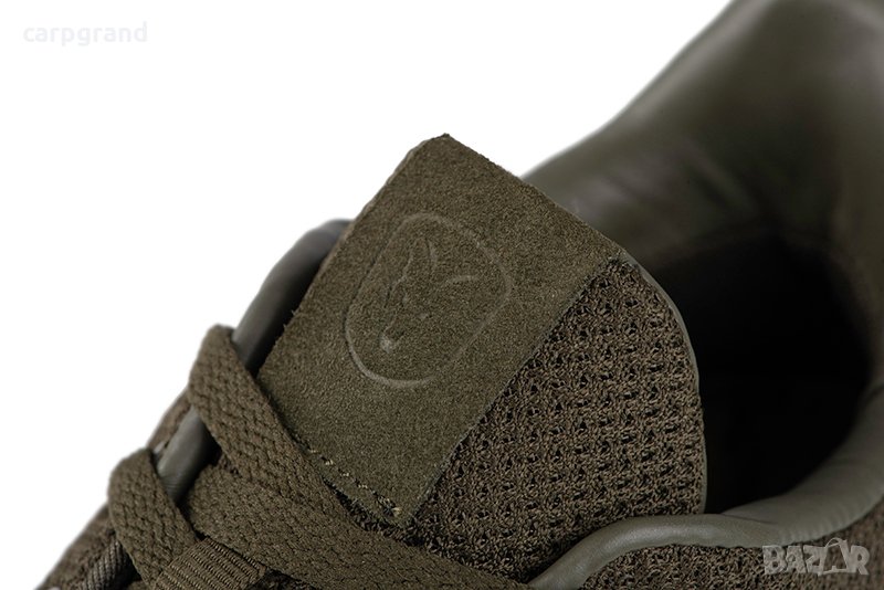 Комфортни риболовни обувки – тип трейнъри, отлични за дните прекарани на къмпинга край водоема. Хибридният модел Fox Olive Trainer съчетава удобството на спортните обувки със здравината на туристическите модели, осигурявайки отлична вентилация през мрежестата материя отгоре и същевременно надеждна защита чрез гумираните панели при пръстите и петата.