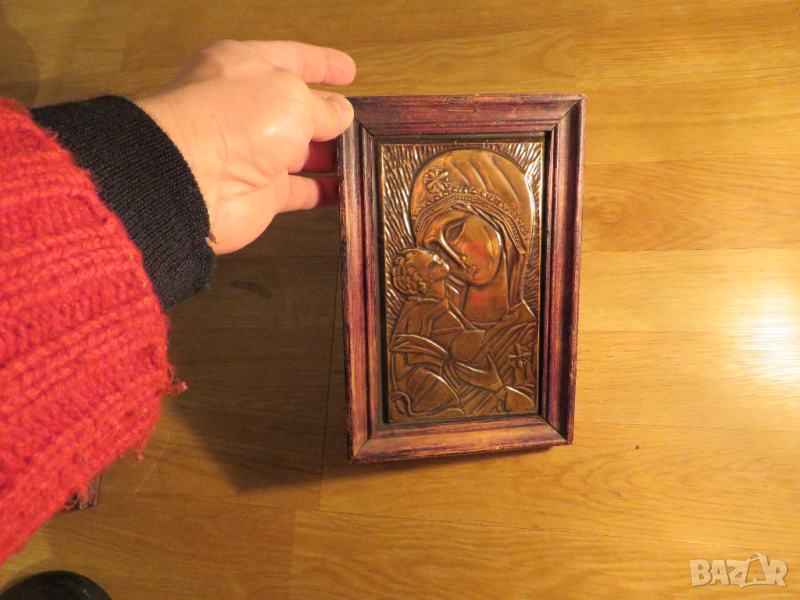 Стара красива медна икона на Богородица с младенеца в дървена рамка - притежавайте тази икона и нека бог и силата му винаги бъдат с вас и да ви пазят и закрилят !