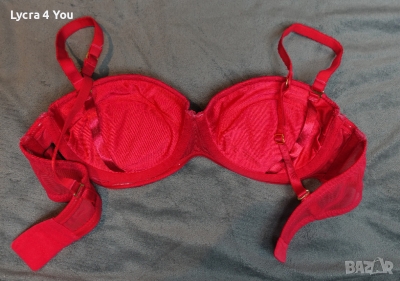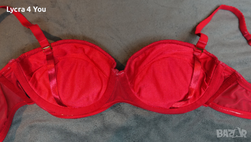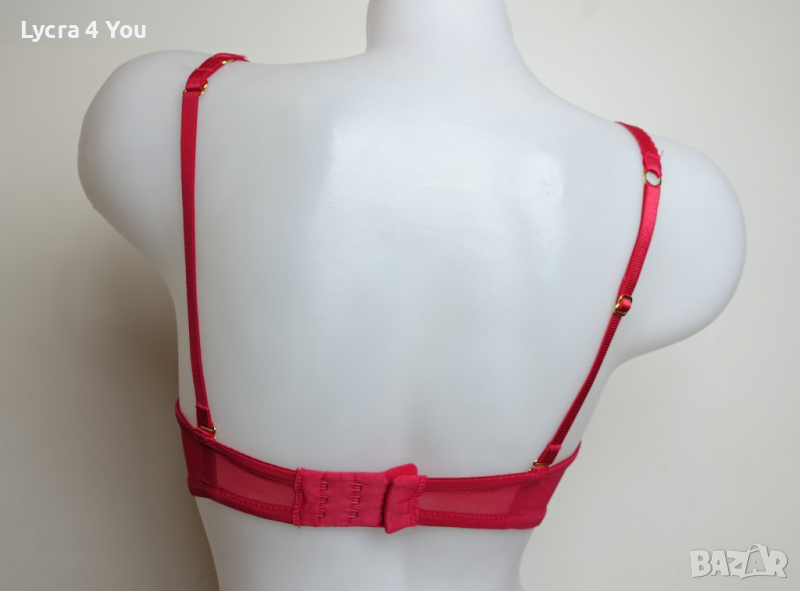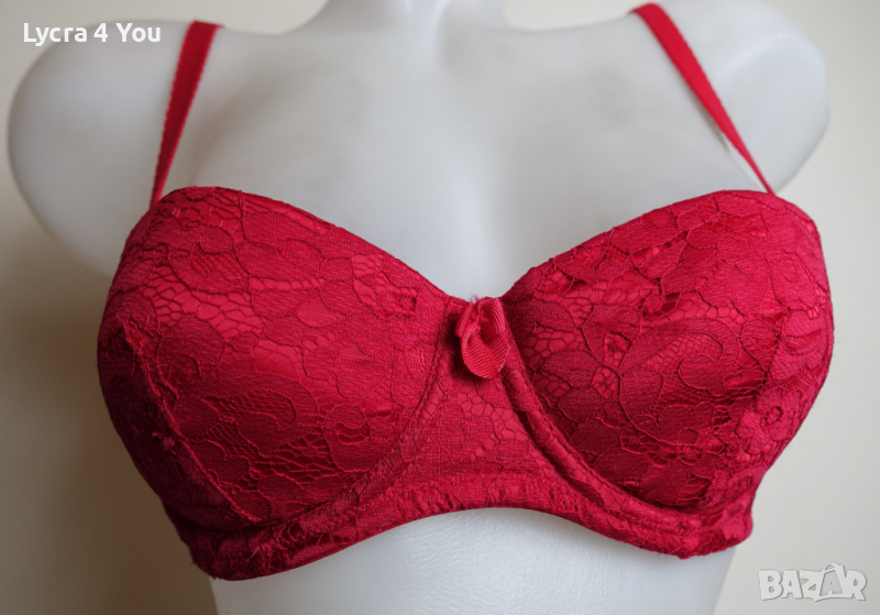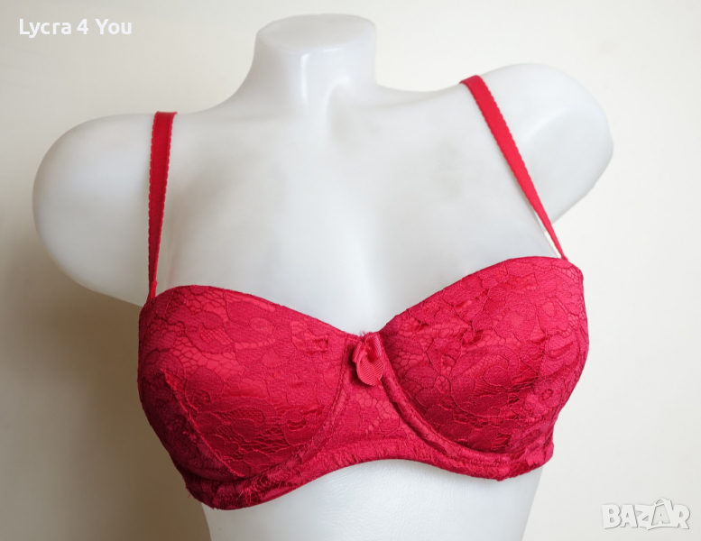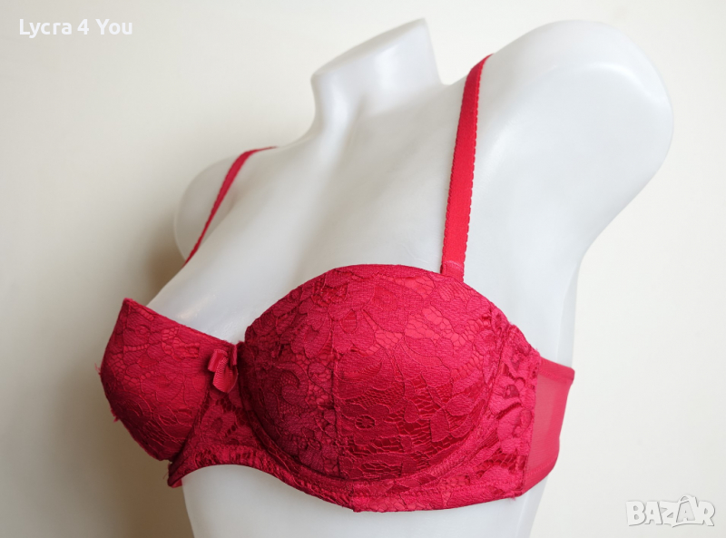 Червен сутиен 75В размер в ярък наситен цвят и дантела покриваща изцяло чашките. Самите чашки са с подплънки, които мисля че могат и да се свалят. От вътре сутиена има силиконови участъци по страничните части против свличане и по добро 'залепване' за кожата.