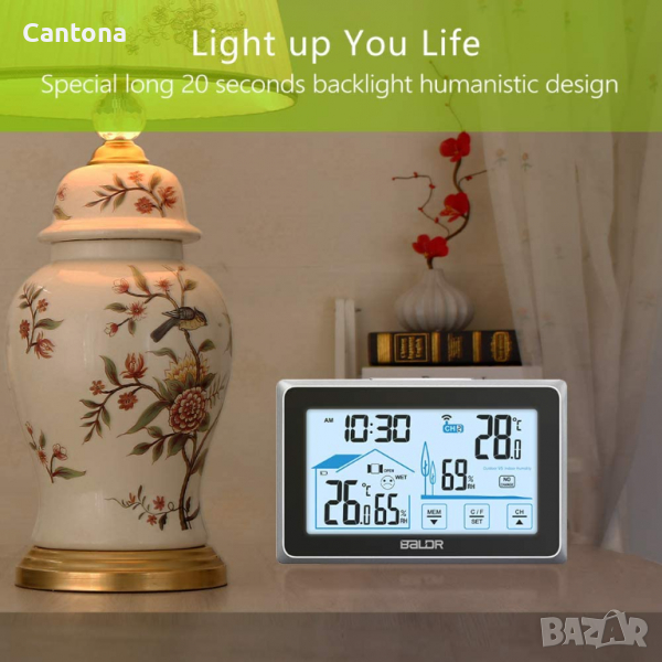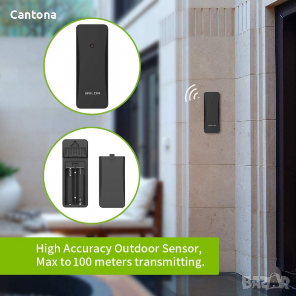 BALDR безжичен вътрешен/външен термометър и хигрометър, сензорен екран с монитор за температура/влаж