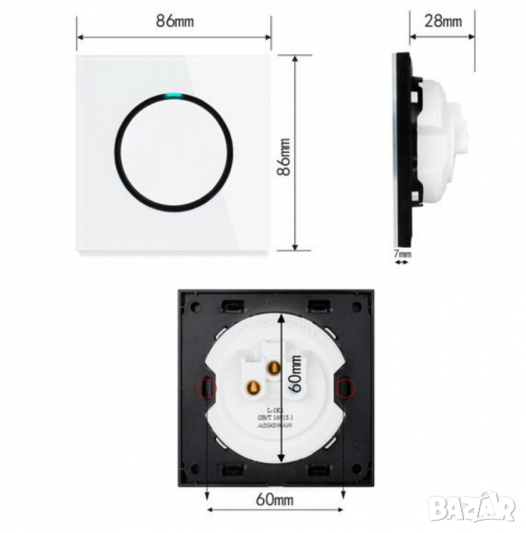 Единичен ключ за осветление. Бял. Монтаж с болтове на 6см отстояние на квадратна конзолна кутия. Превключва чрез клик. Светещ лед индикатор.