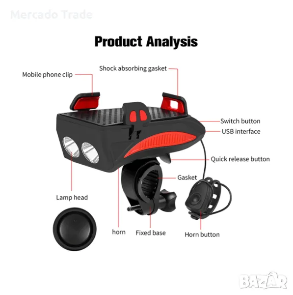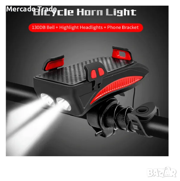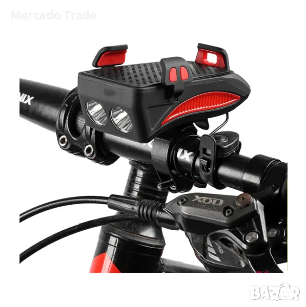 Фар за велосипед 4в1 с поставка, сирена и вградено зарядно 2000 mAh.