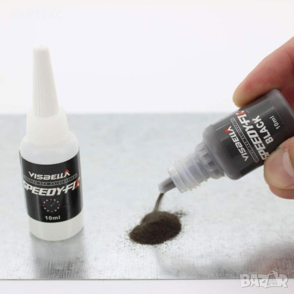 Visbella speedy е двукомпонентно лепило за бързи ремонти, познато още и като течен метал, състоящо се от епоксидна смола и втвърдител. Когато се смесят в равни обеми, смолата и втвърдителят реагират, за да създадат здрава, твърда връзка с висока якост за 4 минути. Предлага се в удобни за изстискване тубички, които се смесват в равни части. Може да се използва като лепило за широк спектър от материали или като универсален пълнител за запълване на празнини, повърхностни ремонти и ламиниране. Не се свива и е устойчив на вода и най-често срещаните разтворители. Може да се оцветява със земни пигменти, цимент или пясък за съответствие на цвета. Може да се шлифова и пробие.
