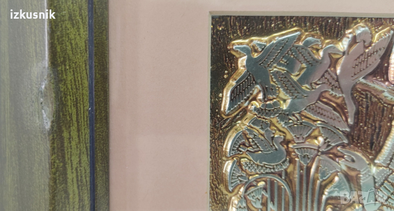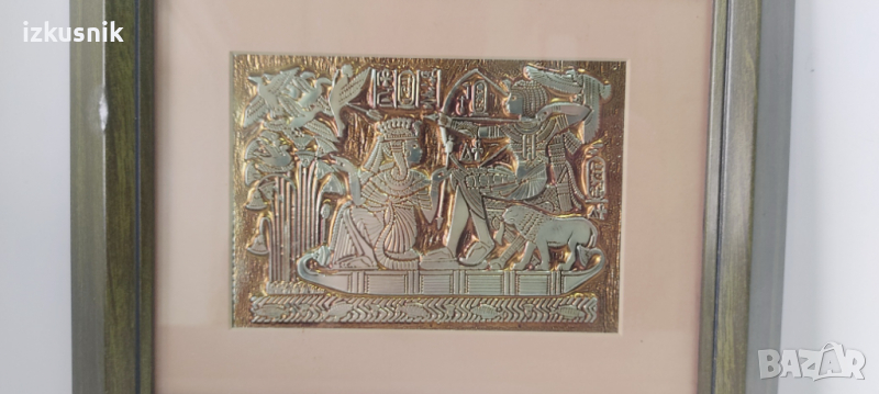 Красива египетска метална пластика, релеф. В рамка, под стъкло. Детайлна изработка. Хубаво съчетание на цветове - сребристо, златисто и нюанси - на пластиката, бежово паспарту и рамка в тъмно зелено с кафеникави жилки.