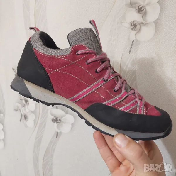 Велурената обувка Zustiegs не само изглежда страхотно, но е удобна от всички страни. Леките обувки с женствено прилягане са с дълбока гумена връзка и устойчиви на износване панели на петата и пръстите. Комбинираната здрава технология на капачката абсорбира ударите върху ръбове, камъни и корени. Неплъзгащата се подметка Vibram осигурява ефективен напредък на всяка повърхност и е основният аргумент за ползата от стабилизиране на конструкцията, без да се свива. Дамските Sticky Boulder са завършени с много високо качество, което се дължи на дългия експлоатационен живот и функционалния си шикозен дизайн. Екстри: Гумена тапицерия, капачка на пръстите Подметка: Vibram Q811 Тегло: 850 g на чифт