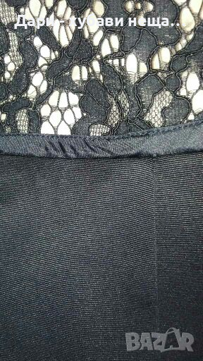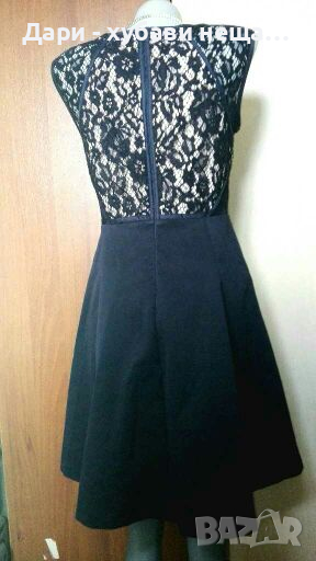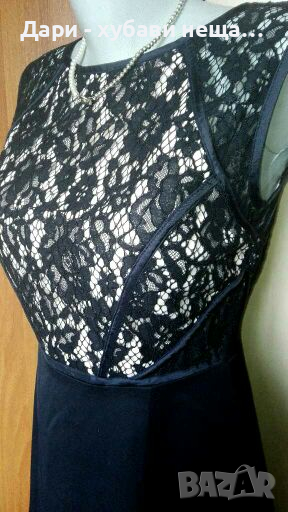 Официална рокля от памучна черна дантела, подплатена с еластичен полиестер с цвят светла пудра, в горната част.Полата е синьо черна, от гладка, еластична и по-твърда матетия, която пада тежко и стои кокектно на страни.Отстрани, над талията, както и при рамената, има прозрачност.Роклята е подходяща за всякакви поводи - бал, сватба, изпращане и др.