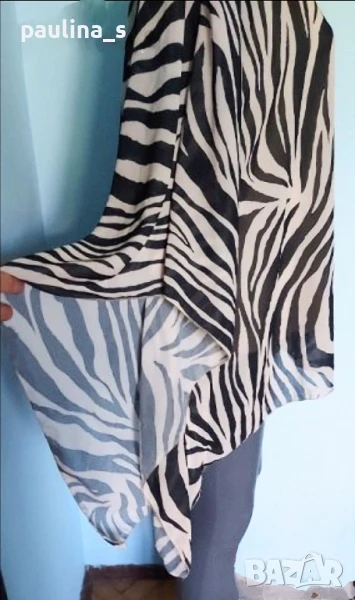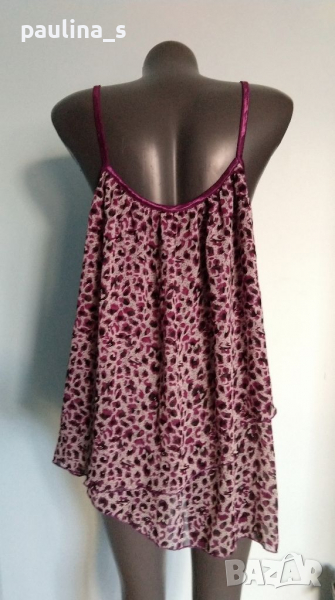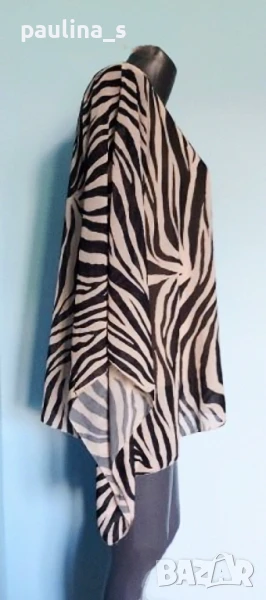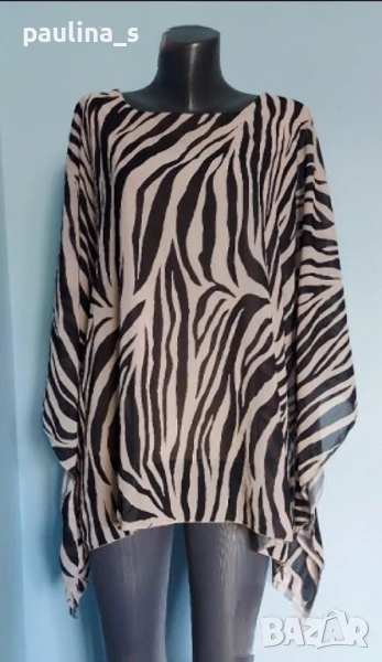 4️⃣. L / 3XL - Френска нова туника в животински принт с хастар "Creme fraiche". Цената е крайна 49,99лв. Уникална френска туника или топ в животински принт с хастар, нова без дефекти, една бройка, става за посочените размери. Хастарът е с кройка на бюстие, а шлейфът е фиксиран със странични тегели. Мерките са свалени от Бюстието!