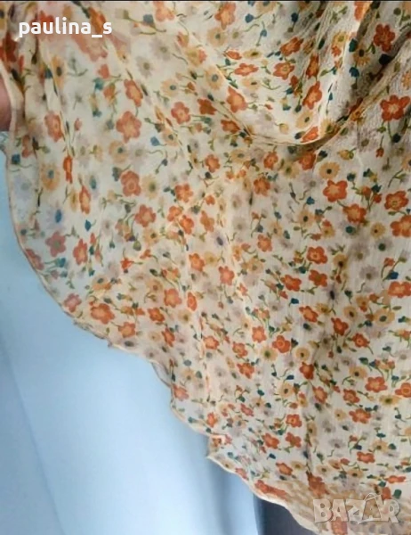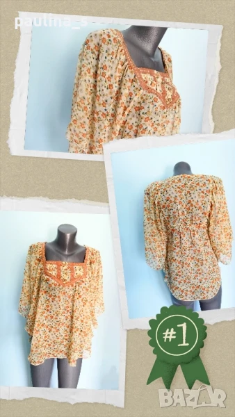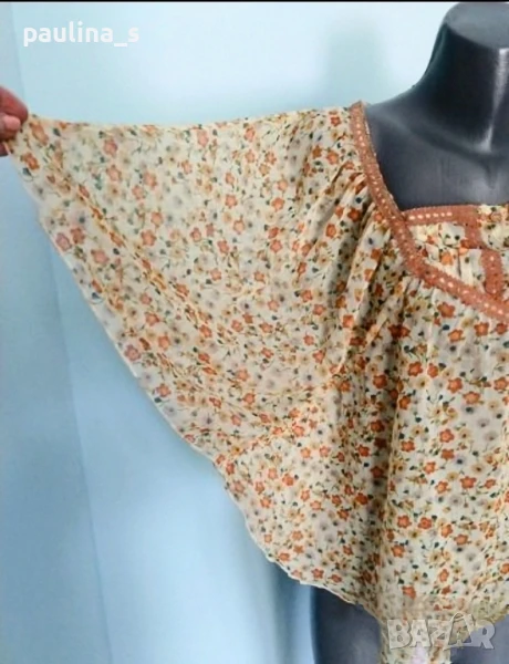 3️⃣. S / 2XL - Ефектна блуза тип туника във флорален принт. Цената е крайна и съобразена - 19,99лв. Весела и ефектна дамска блуза тип туника с прилеп ръкави и декорации от оранжева дантела. Моделът позволява да се носи от няколко размера. Материята е копринен шифон с прозрачност, много нежна и приятна за носене на голо. Може да се носи и като плажна туника, може да се носи и върху топ или потник в подходящ десен. Има корекция на единия ръкав отзад, съобразена цена.