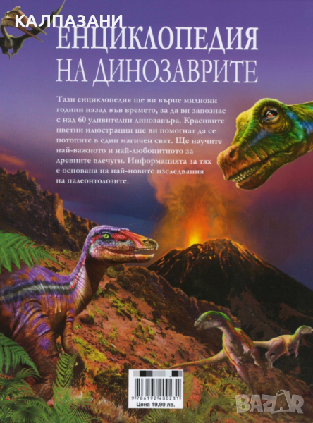 Тази енциклопедия ще ви върне милиони години назад във времето, за да ви запознае с над 60 удивителни динозавъра. Красивите цветни илюстрации ще ви помогнат да се потопите в един магичен свят. Ще научите най-важното и най-любопитното за древните влечуги. Информацията за тях е основана на най-новите изследвания на палеонтолозите.