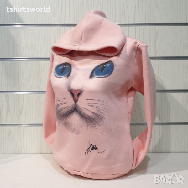 Нов дамски суичър с качулка, две джобчета и 3D дигитален печат Котка със сини очи в розов цвят. Произведен в България под марката PRINTEX от висококачествен памук, което го прави изключително топъл и желан от нашите дългогодишни клиенти. Моделът е подходящ за пролетния и есенно-зимният сезон, има ластични маншети на китките и ханша, запазващи топлината. Разполага с мека подплата и два отворени джоба в страни. Вталена кройка го прави подходящ както за спорт, така и за ежедневно носене с дънкови панталони. Марката PRINTEX от години се слави със своите топли и качествени суичъри.
