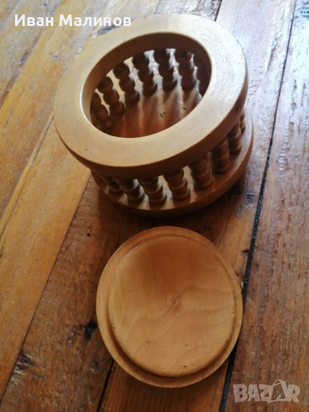 Стара дървена кутия. Сейф. Тежка и масивна. Височина 15. Диаметър 16 см. Състояние видно от снимките. Отлично