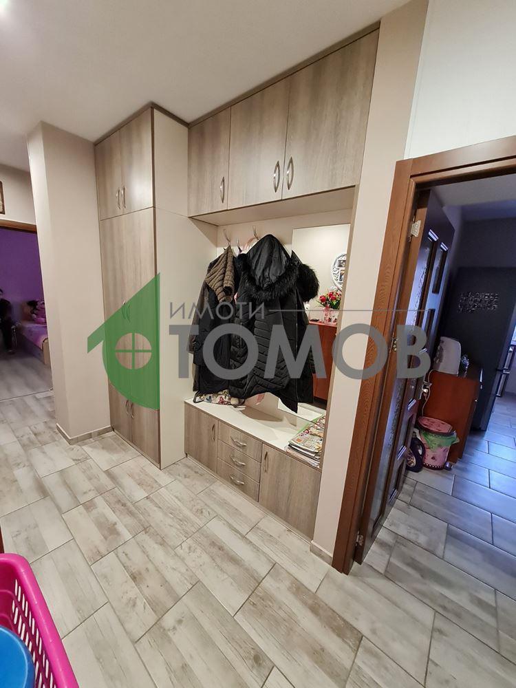 Имоти Томов представя на Вашето внимание тристаен апартамент, находящ се на осми, последен жилищен етаж, в сграда с отремонтиран покрив, контрол на достъпа, асансьор и отлично поддържани общи части, находяща се на минути пешеходно разстояние от централната пешеходна алея на град Шумен и в непосредствена близост до Новата и Старата поликлиника, аптеки, банка, автобусна спирка, училище. С жилищна площ от 73 кв.м., имота е със следното разпределение:
