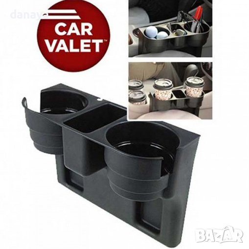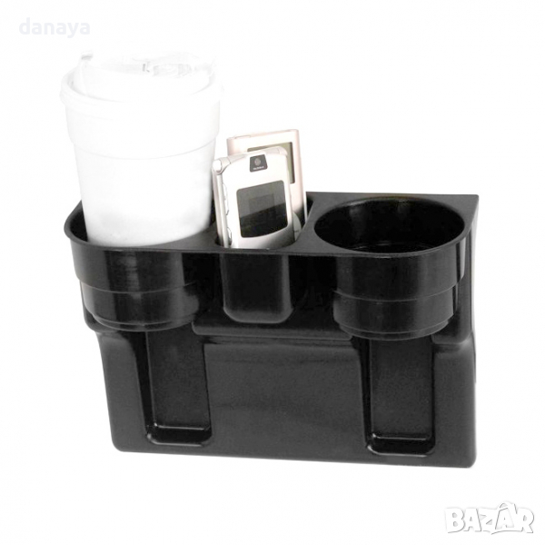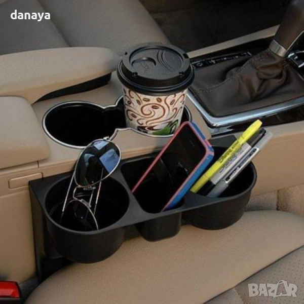 органайзер за кола. Този органайзер добавя 2 поставки за чаши и място за мобилен телефон или слънчеви очила за секунди. Той просто се поставя между седалките и ви дава допълнително място за вещи. С водачи за кабели, така зарядното за телефона ви е винаги под ръка. Универсален дизайн – пасва на повечето марки автомобили.
