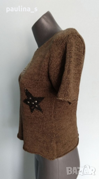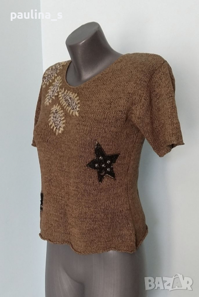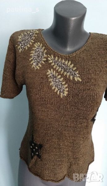 Блуза с декорации от копринена прежда, О-образно деколте, къс ръкав и втален силует. Плетивото дава еластичност и покрива няколко размера. Без забележки. Моля, разгледайте и другите обяви и последвайте профила. При покупка за над 50лв, поемам част от доставката до офис на Еконт и правя отстъпка от общата цена, така цената за доставката не изглежда твърде непосилна. Приятно разглеждане. Продажбата е с благотворителна цел, цената не се коментира по никакъв начин. Благодаря за вниманието и отделеното време 🙂