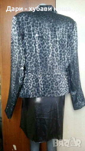 Роклята е с цялостна подплата, от много гладък плат е, който пада тежко.Силуетът е със свободна талия.Чисто нова, с етикет, подходяща за официален повод.Сакото от снимките много си отива с роклята и е подходящо по размер, цената му е 15лв - също ново.Отстъпка при покупка в комплект.