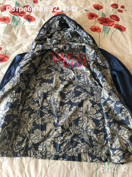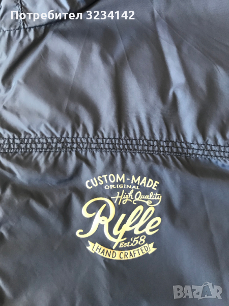 Пролетно яке Rifle с две лица от едната страна е изчистено синьо , а от другата страна е шарено на цветя има и надпис . И от двете страни има по 2 джоба . Ципът се закопчава до горе заедно с качулката . . Горницата е като нова , слагана е няколко пъти. Дължина от рамото до долу 65.5 см . Размер на подмишниците ( ширина )54 см .