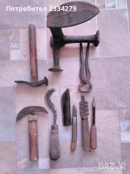 N:1кожарски,обущарски автентични инструменти-ножове,чукове 8€. брой ,произведени в различни времена,повечето ръчна изработка. N:2 наковални 4 различни броя с цена 13€. за брой; N:4 стари разширяващи дървени калъпи, уред за разпъване на обувките, различни размери, цена 5€. бройка.; N:5 другите инструменти от 3 до 5€. (Ножчето с калъф продадено)