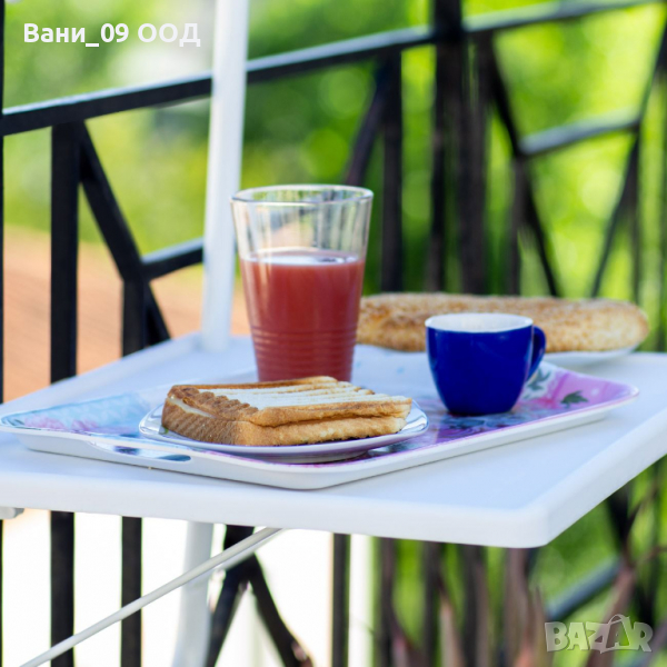 Тази красива и практична масичка е идеална за парапет на балкон или тераса. Има регулируема височина в 3 позиции от 48 см до 55 см и лесен монтаж върху парапета. Повърхността на масата е 51,5х39,5 см и ви спестява място. Когато не се използва, се затваря и се съхранява.