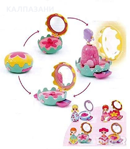 Кукла Camellia в чантичка с гланц и сенки Магическа тоалетна масичка със светещо огледало и мини кукла се превръщат в комплект гримове за малките дами. 1.Натисни бутона за да отвориш комплекта. 2.Открии тоалетна масичка за мини кукличката и комплект гримове за момичета. 3.Постави куклата в комплекта и огледалото ще светне. Запознайте се с Камелия, Магнолия, Жизел и Лови. Играчка за деца над 5 години