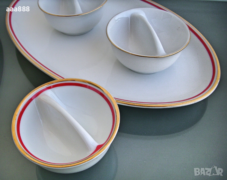 Комплект два броя овални чинии плато, три солници и две сосиери с капак от първокласен бял порцелан Бохемия. Декорация с червен и златен широк кант. Нови, неупотребявани. Фабрично маркирани. Описание и единични цени както следва:
