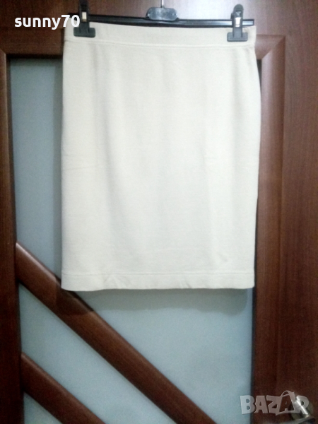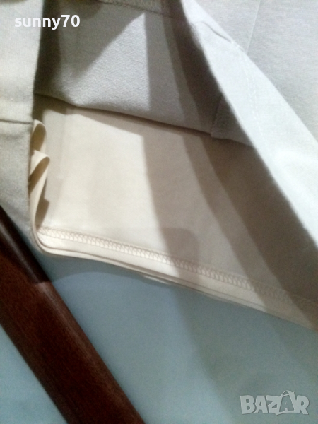 Цвят екрю, отлично състояние.Има леко завалване само от вътрешната част на талията при колана,иначе е много хубава материя стегната ,нещо като трико.