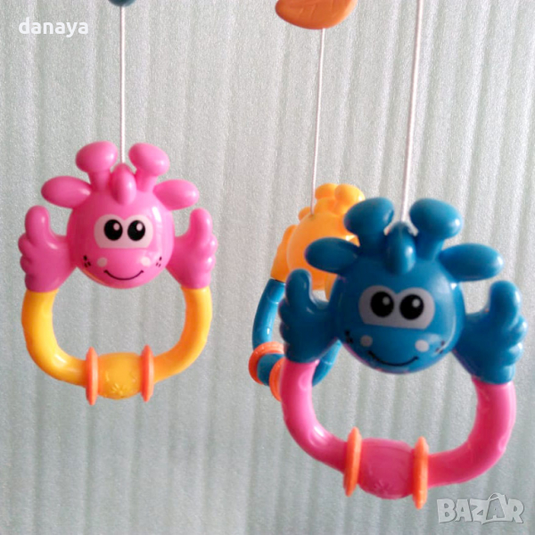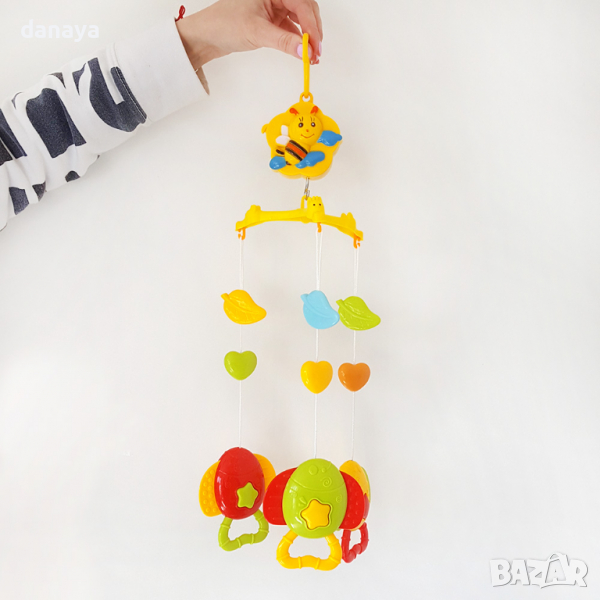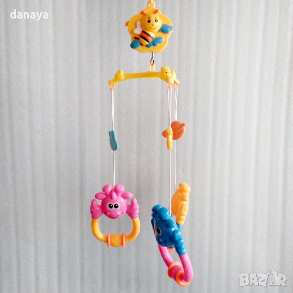 Музикална въртележка за легло с животни жирафчета, които се държат върху весела музикална пчеличка. Пчеличката има мелодия, която може да се спира и пуска с помощта на копче. Трите дрънкалки дрънкат. Цветни и весели играчки дрънкалки за бебе. Чудесен подарък за новородено бебе.