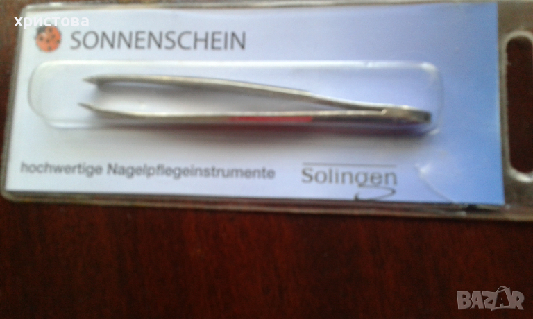 Пинсетата е немско производство със скосен връх и ръчно обработени щипци. Осигурява хващането и на наи фините косъмчета.Опаковката и малко се сцепи//вижда се на две от снимките// до надписа ,,Солинген,,докато я вадех за снимките.