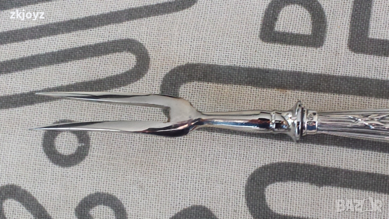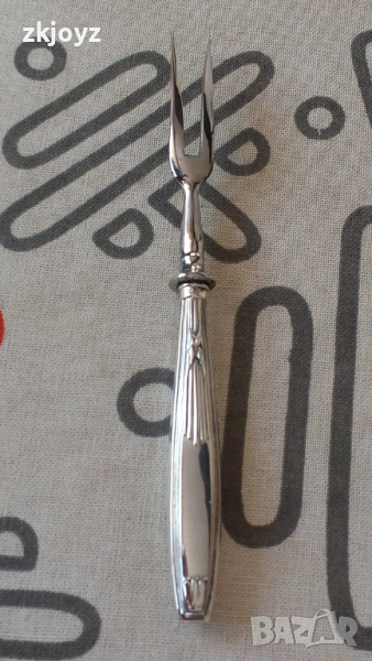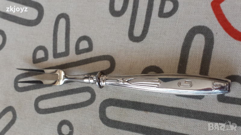 Виличка за десерт с монограм върху дръжката от 20-те години на миналия век . Изработена от сребро проба 800 маркирана (виж снимките) на дръжката. Предната част с двата шипа е метална.