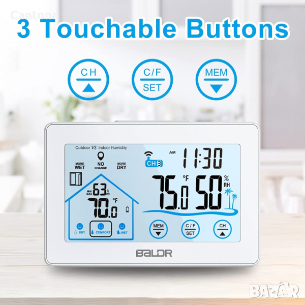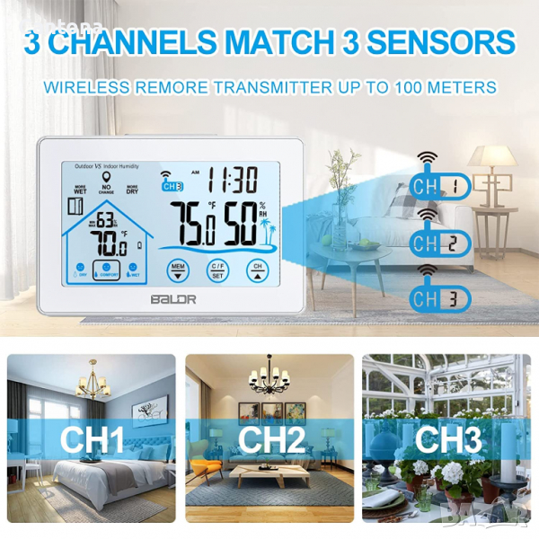 - До 3 RF канала за 3 външни сензора, показване на различни данни за местоположение чрез избор на канали (CH). Мониторът за температура и влажност на външния сензор записва максималната/минималната температура и влажност. Температурата и влажността се изпращат до приемника на всеки 10 секунди, което поддържа данните много точни и чувствителни.
