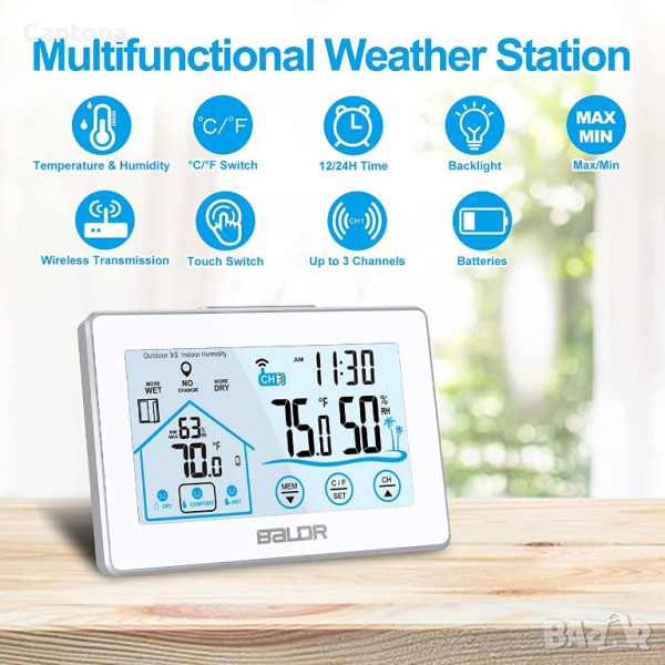 Безжична метеорологична станция BALDR с външен сензор, вътрешен и външен хигротермометър, подсветка