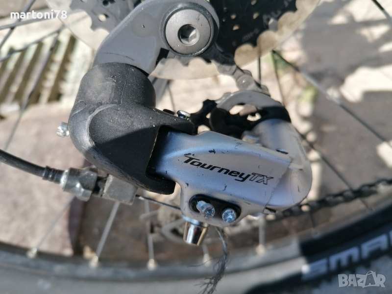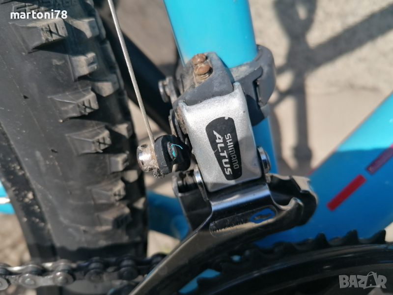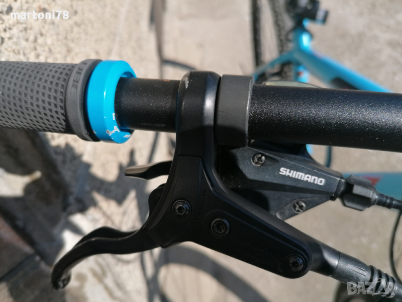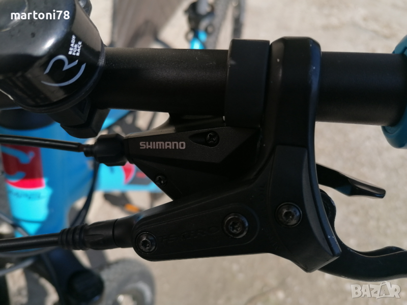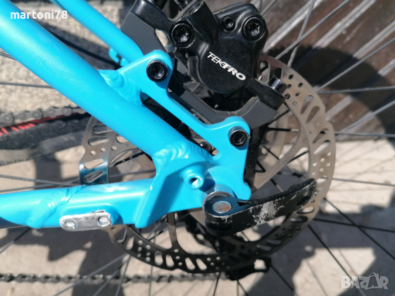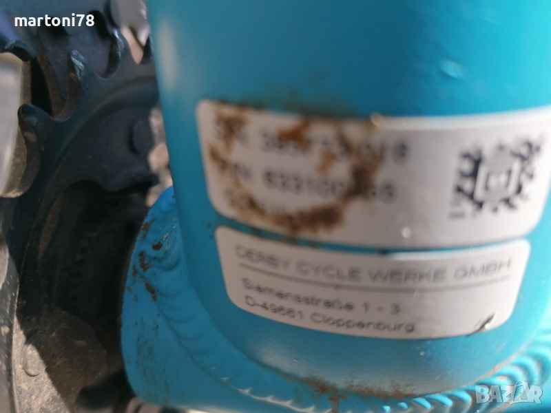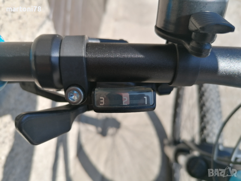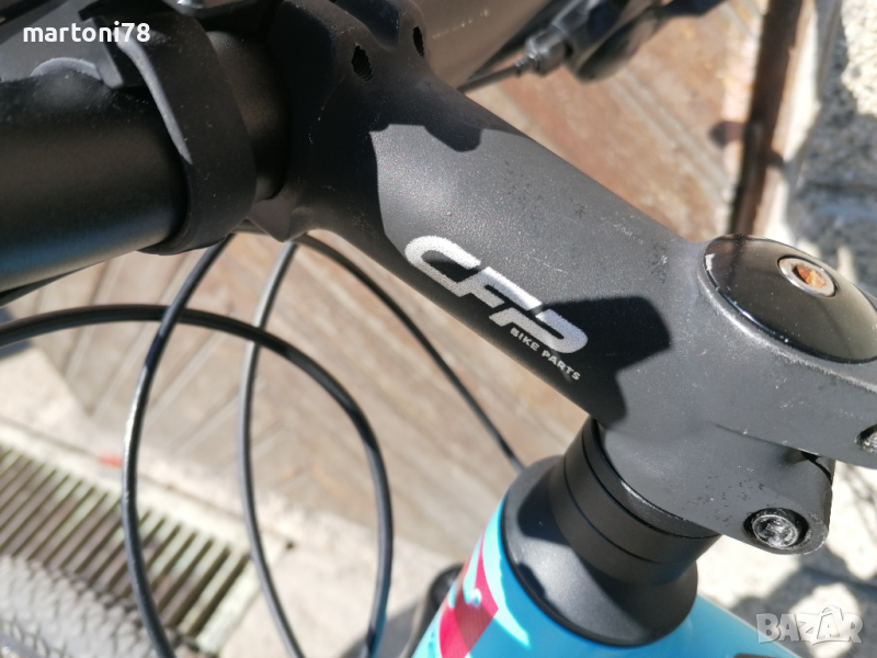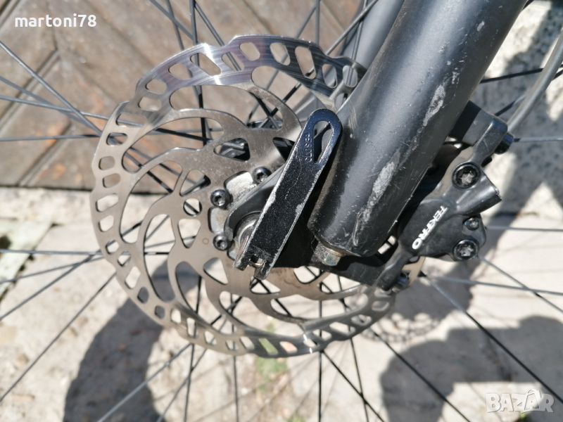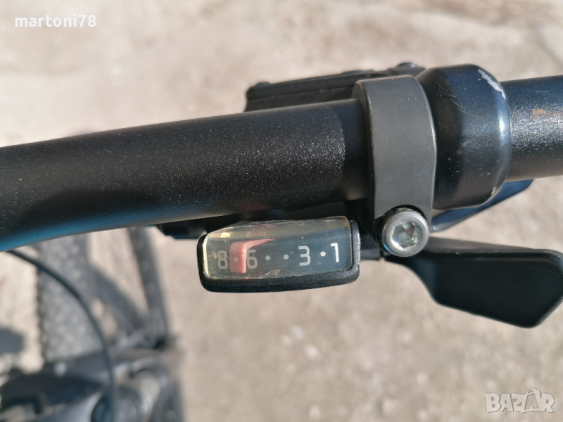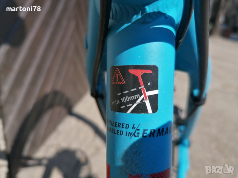 Велосипеда е произведен в Германия. Алуминиева рамка, хидравлични дискови спирачки ТЕКТRО. Телескопична вилка SR Suntour. Палцови команди Shimano. В изключително добро състояние. Размер на рамката 50 см. от централната ос до скобата на колчето на седалката и 60 см. от оста на кормилото до скобата на колчето на седалката.