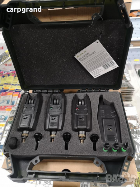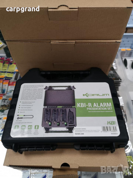 Kомплектът Korum KBI-R Bite Alarm Presentationсъдържа три броя сигнализатори,