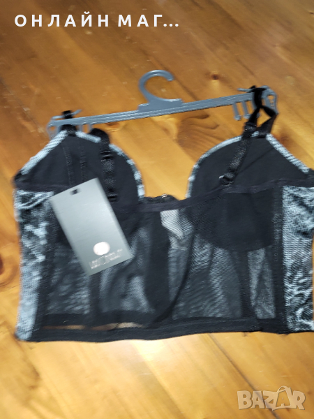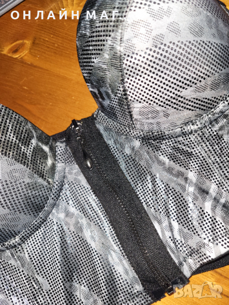Дамски кожен сутиен с предно закопчаване, посредством цип. Комбинация от екокожа и тюл. С банели и подплънки.