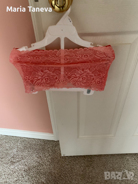Бюстие в цвят”сьомга”, предницата е плътна, памучна, а на гърба е дантела. Обличано е само един път по повод.