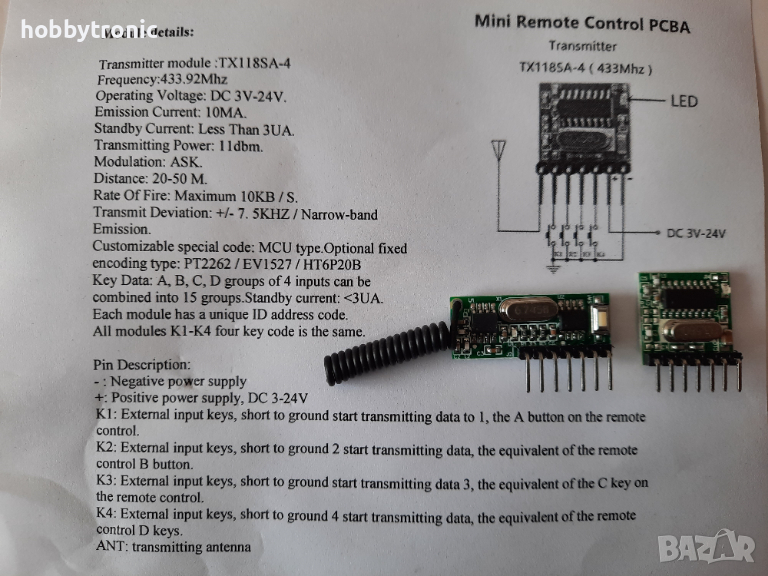 Продавам модули приемник и предавател с фиксиран код на 433MHz (code learning).