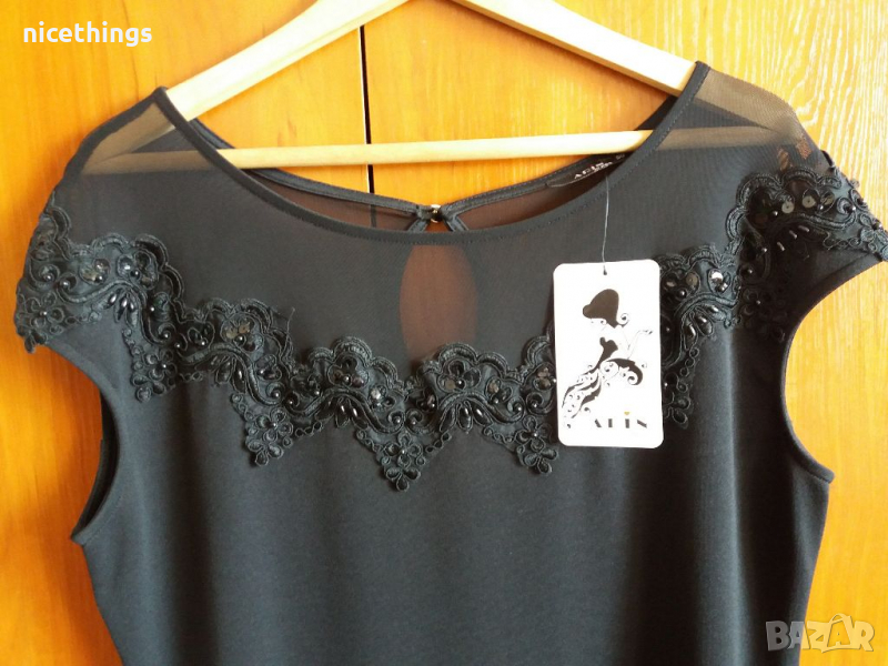 Нова черна елегантна рокля размер 50.Ширина под мишници 51 см.Дължина от рамо 95 см.Материя полиестер/еластан.С подплата .Цена 30 лв