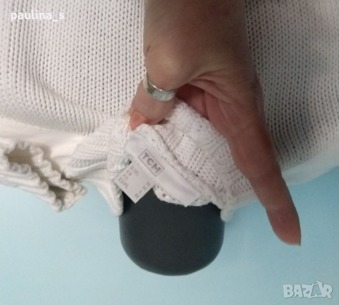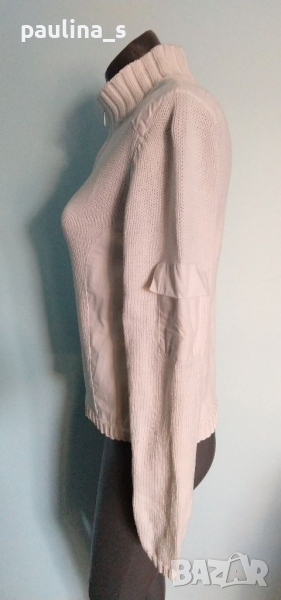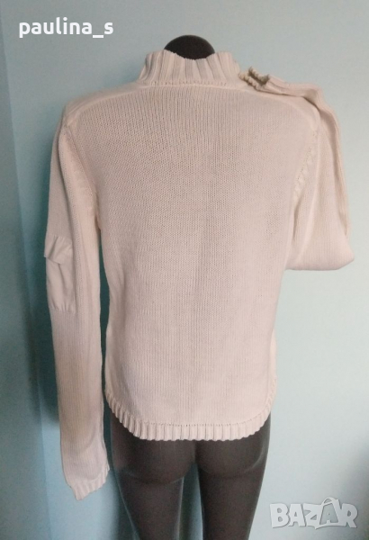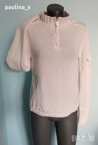 1. M / 2XL - "TCM" Бял брандов пуловер тип суичър с висока яка, декорации от платки в страни, джоб на ръкава и висока поло яка с цип. Моделът е прав, но платките дават вталяване при обличане, ръкавите се носят подгънати. Материята е 100 % органичен памук, хипоалергична и плътна, плетката дава възможност да се носи от няколко размера и скъсява ръкавите.