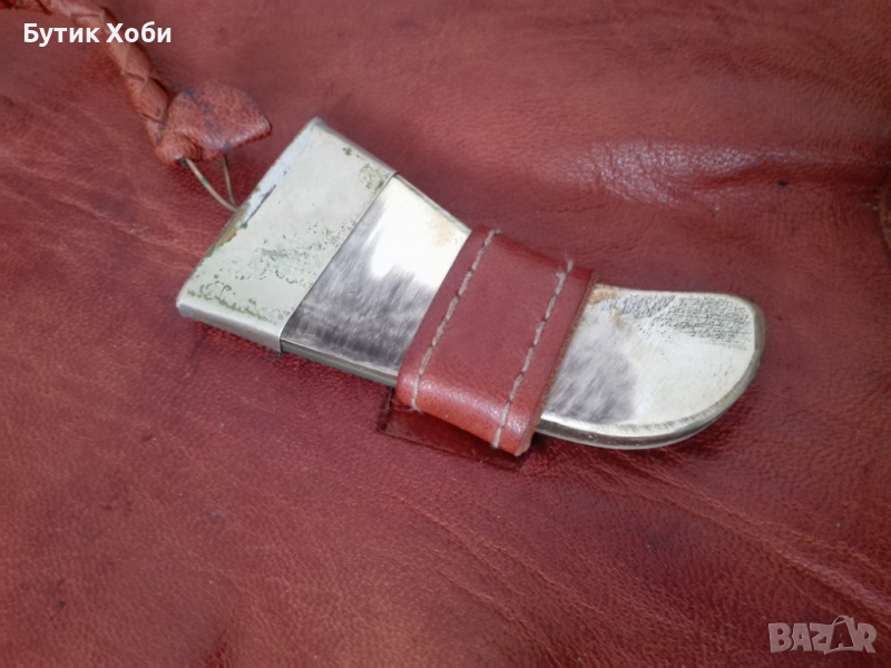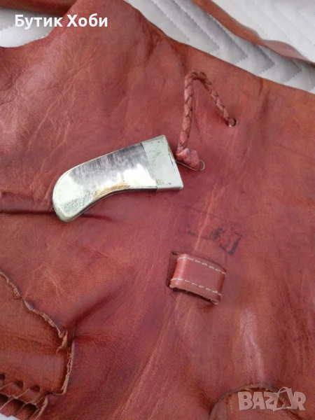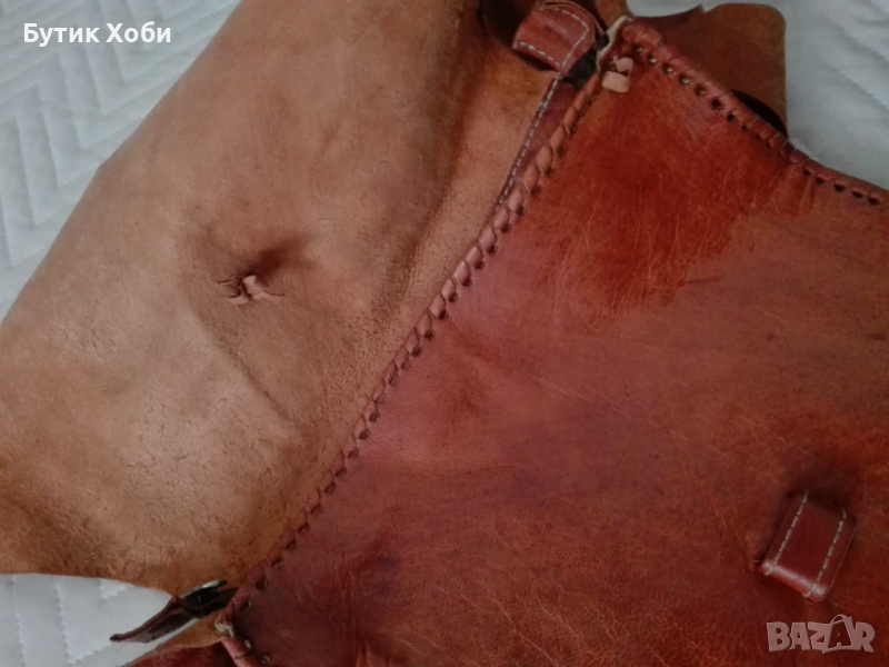 Атрактивна чанта от естествена камилска ? кожа.Състояние на кожата е перфектно - без разкъсвано и изтъркано. Има козметични дефекти - петънца (снимките). Закопчалка - естествен рог. Размер - 25х27см.