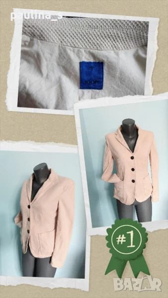 1️⃣. M / XL - "Joop!". Цената е крайна 34,99лв / 17,5 евро. Аутлет, една бройка, като ново! Изумително вталено еластично сако, цветът е светло розово! Моделът е обран, класика в жанра. Материята е вафлена - памук и ликра, доста еластична, хипоалергична и покрива няколко размера. За еластичността сверете с една от снимките. Дрехата е много изпипана, с раменна платка и подсилени вътрешни тегели. Без хастар, подходящо е и за топло време. Класата си е класа.