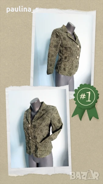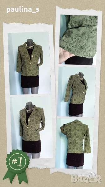 2️⃣. Колаж / XS / M - "True grit". Цената е крайна 29,99лв / 15 евро. ВИНТИДЖ! Зелено дънково сако от рязана английска бродерия. Моделът е обран, втален, с външни джобове и 7/8 ръкави, материята е 100 % индийски памук, без еластичност. Не е чисто ново, но е без дефекти.