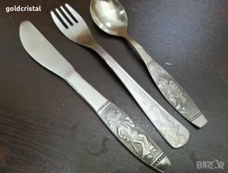 стари руски прибори за хранене детски комплект с приказни герои неръждаеми сервиз комплект сет лот ретро арт декор винтидж колекция стари антикварни предмети обзавеждане за дома и семейството подходящи за подарък за ценители и колекционери