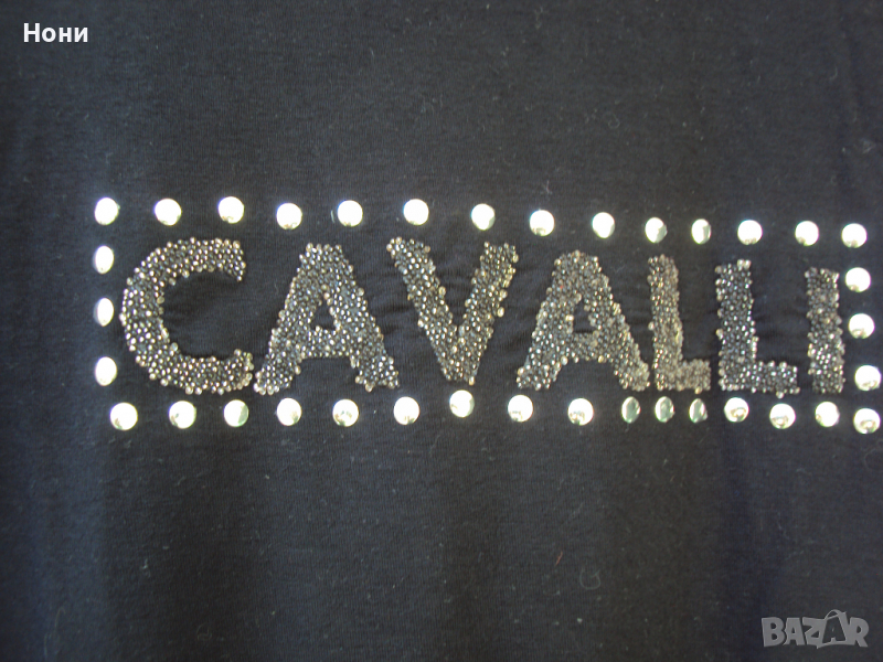 Маркова блуза на Роберто Кавали ръст С. Размери: Дължина на ръкава 57 см. Дължина на блузата 50 см. От рамо до рамо 34 см. От подмишница до подмишница 40 см. Купена от Италия. Материята е трико. Логото отпред на блузата е със много интересни блестящи топчици ситно наредени една до друга! Оригинална! Обличана до пъти! Няма забележка!
