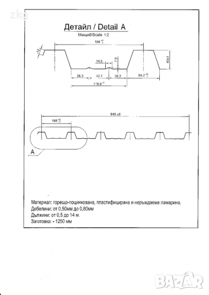 лв/лин.м. за дебелина 0,50мм и RAL3009, 3011, 5010, 6005, 7043, 8017, 9002 и