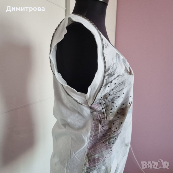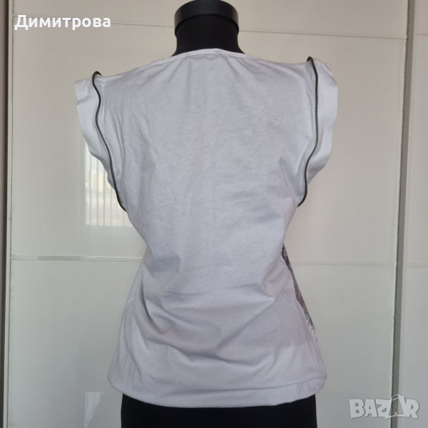 Дамски топ в бяло с принт и камъчета в предната част. Ефектни ципове на ръкавите.Обличан рядко.Без забележки