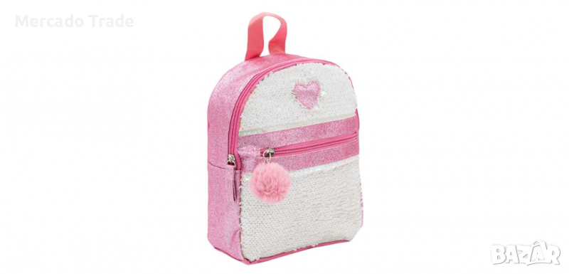 Детска раница за момиче, розов блясък, вълшебни розови пайети, розово сърце и пон пон на закопчалката. Има мек гръб и регулируеми презрамки.